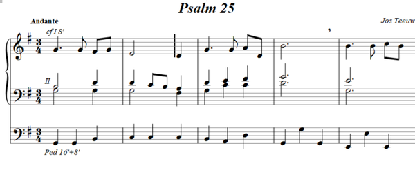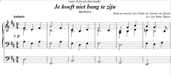 Inhoud : Ruis, o Godstroom der genade - Jan Peter Teeuw; Psalm 25 - Jos Teeuw; O Christus die de zonne zijt - Johan den Hoedt; Psalm 73 - Jan van Westenbrugge; Je hoeft niet bang te zijn - Jan Peter Teeuw